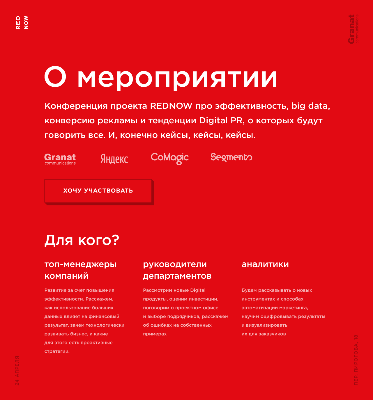 The garish red color was used in the brand identity, which was moved to the promo site. Ugly red stands for all the worst in the advertising world. By moving the cursor, we remove all unnecessary stuff, leaving only the main message.